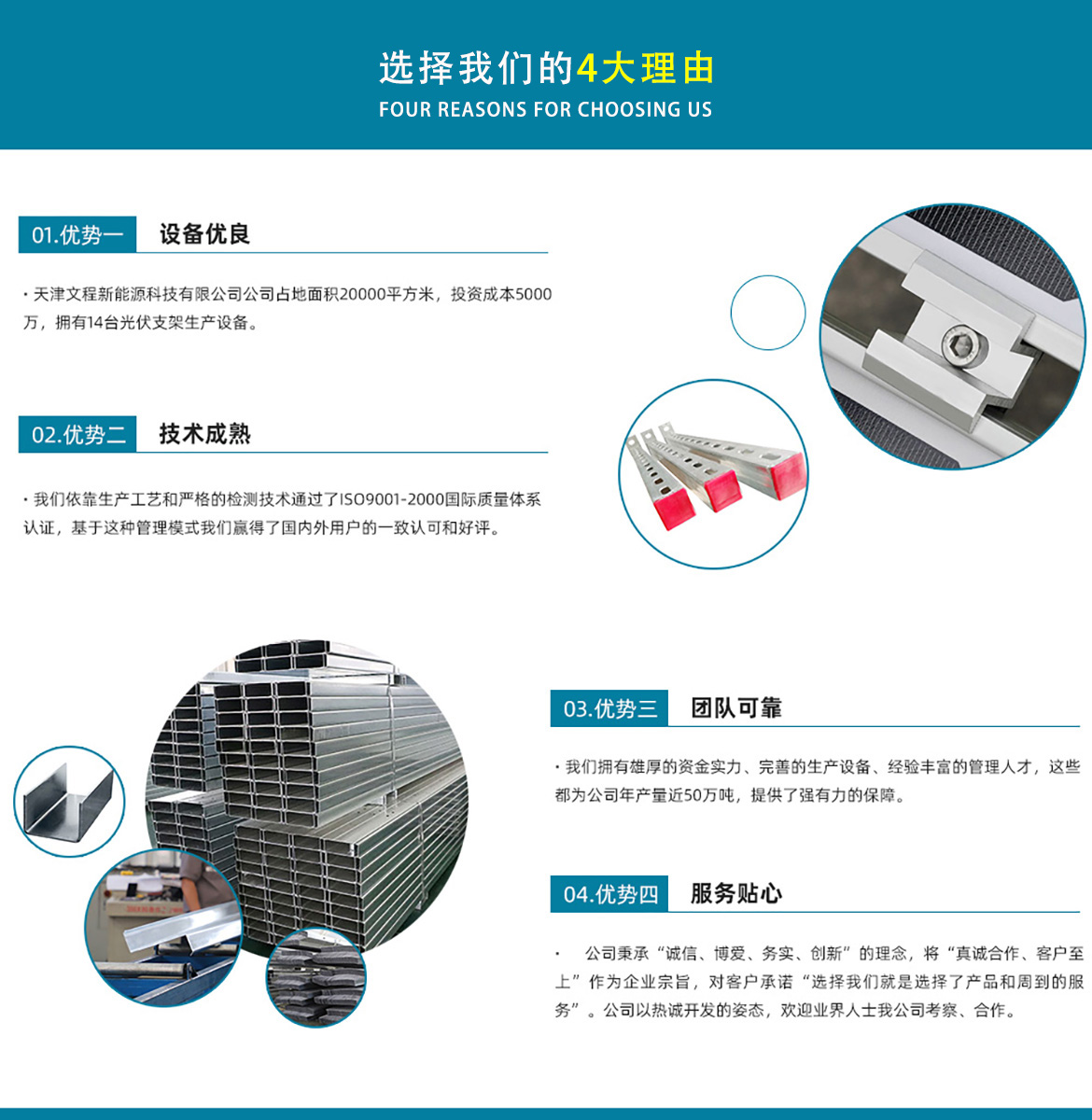 天津文程新能源科技有限公司成立于2021年,是專(zhuān)注于集中式、分布式、漁光互補(bǔ)和農(nóng)光互補(bǔ)等清潔能源發(fā)電的綜合性企業(yè) 公司是集設(shè)計(jì)、研發(fā)、生產(chǎn)、制造為一體的綜合型企業(yè)。公司占地面積20000平方米,注冊(cè)資金5000萬(wàn)元整。公司坐落于華北鋼鐵重鎮(zhèn)--大邱莊,距天津市區(qū)50公里、鄰104和205國(guó)道及京滬高速,交通十分便捷。 本公司擁有三個(gè)生產(chǎn)車(chē)間,其中兩個(gè)冷彎型鋼車(chē)間,一個(gè)鋅鋁鎂型鋼車(chē)間,擁有自動(dòng)冷彎成型機(jī)10條,自動(dòng)數(shù)控沖孔機(jī)10條以及焊接加工等設(shè)備。主要生產(chǎn)產(chǎn)品有:太陽(yáng)能光伏支架、各種規(guī)格的C/Z/U型鋼、抗震支架、管廊支架及整套配件等。